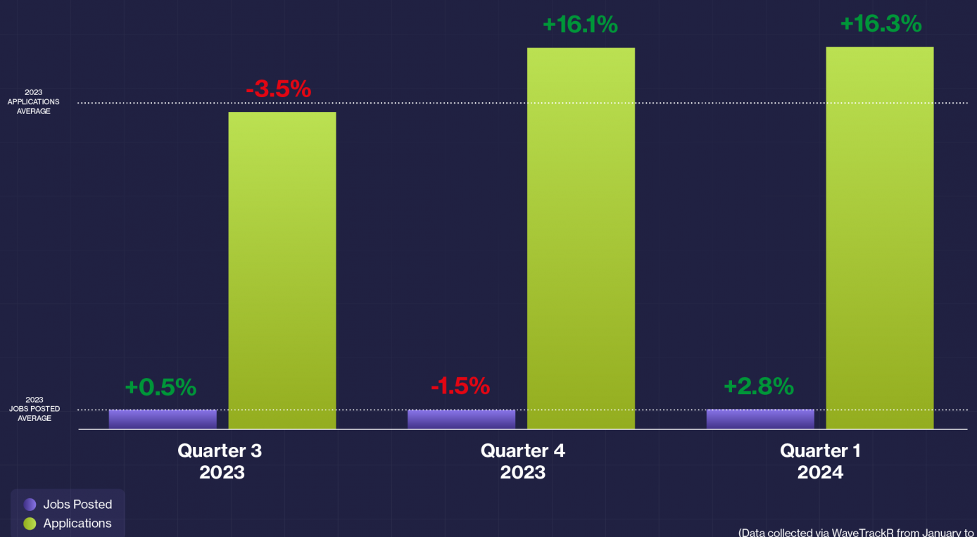 Data and extracts taken from Wavetractr Quarter 1 2024 Recruitment trends report. Full report can be found at Recruitment Data Q1 2024 Recruitment Trends Report - Wave (wave-rs.co.uk)