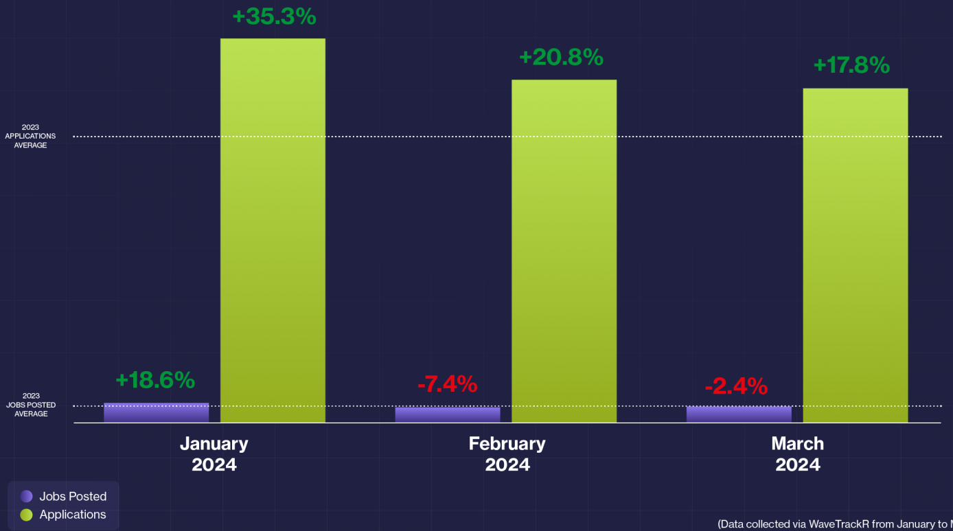 Applications in Q4 2023 picked up on Q3’s numbers and remained high in Q1 2024, with each month in the first quarter of the year achieving a higher rate of applications than the 2023 monthly average. Applications were highest in January – over 35% higher than 2023’s monthly average, proving that the new year, new job trend is still alive and kicking. February and March’s applications dipped from January’s figures but remained well over the 2023 monthly average.