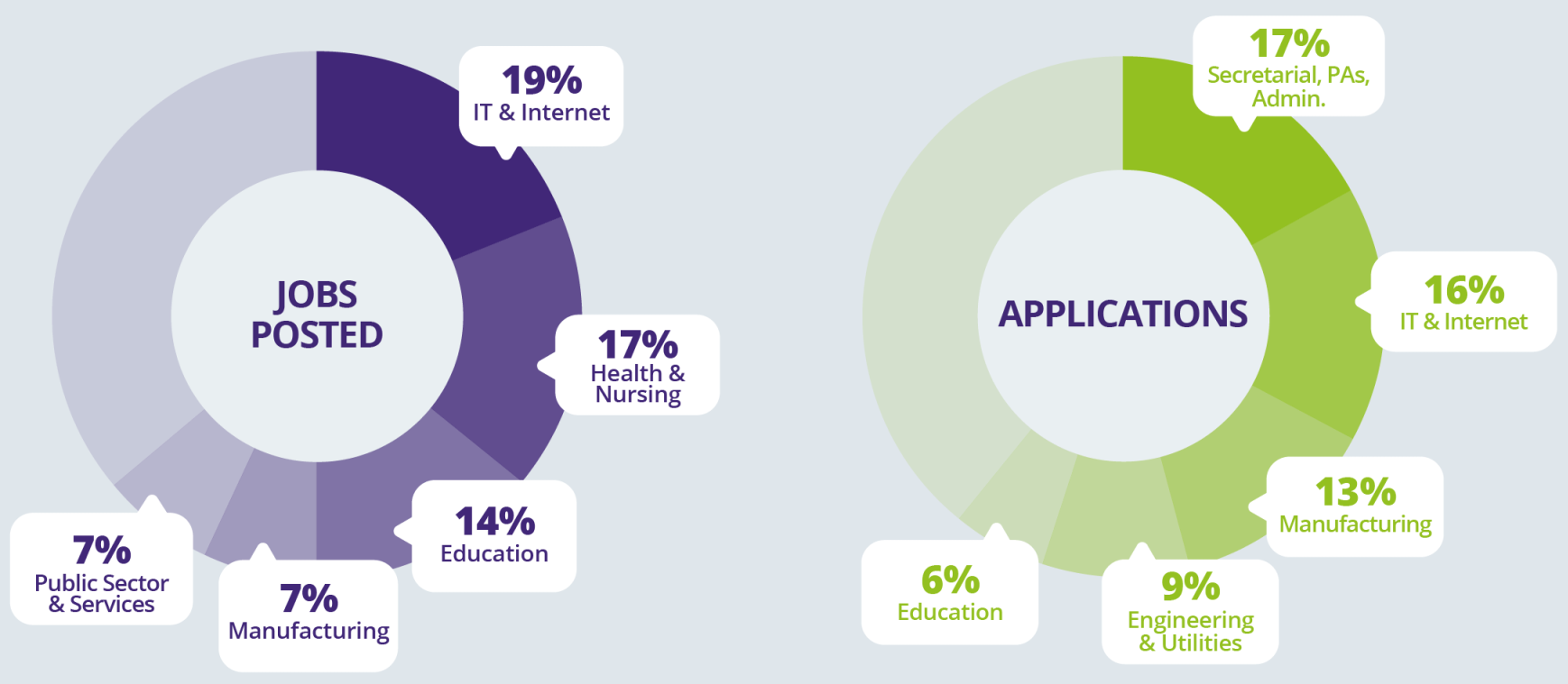Perennially job-heavy IT & Internet posted the highest percentage of jobs in Q2 (19%) but Health & Nursing were only just behind with a 17% share. IT & Internet receives a similarly large percentage of applications, however Health & Nursing doesn’t even make it into the top 5 for applications, highlighting its historic but still very present skills shortage.