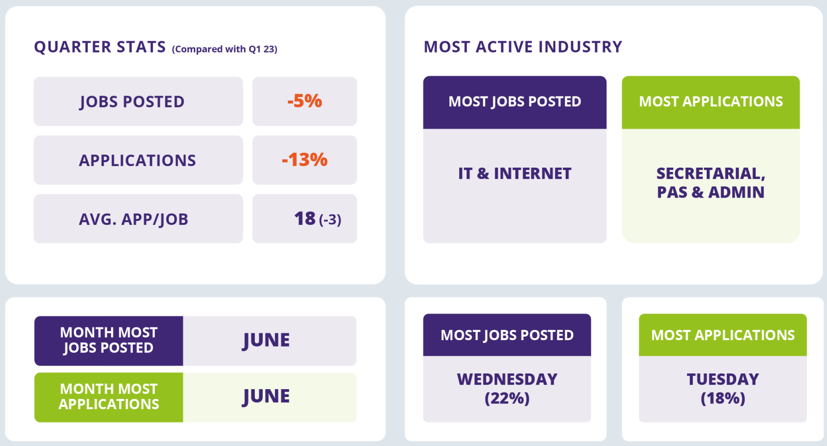 - The industry posting the highest percentage of jobs in Q2 was IT & Internet, which is unchanged from the first quarter, although the percentage share did drop. The industry receiving the highest percentage of applications has changed from Q1, with Secretarial, PAs & Administration knocking IT & Internet from the top spot.