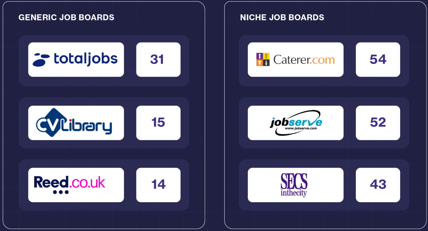 In our comparison table, we found that Totaljobs, CV-Library, and reed.co.uk consistently receive the highest average number of applications per job among generic job boards, with 31, 15, and 14 applications, respectively. For niche job boards, Caterer, Jobserve, and Secs in the City lead the pack with average application rates of 54, 52, and 43, respectively.