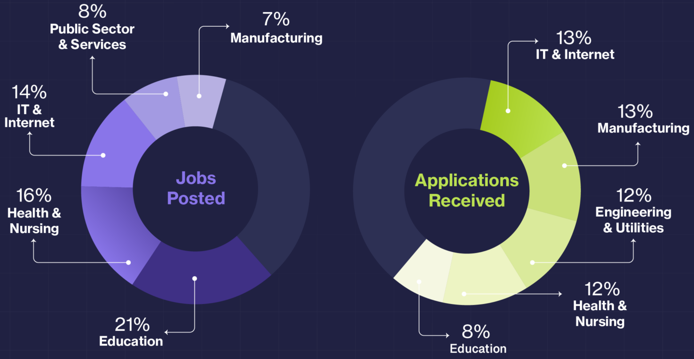 The industries with the highest number of job postings and applications are often seen as the most competitive. Education (21%), Health & Nursing (16%), IT & Internet (14%), Public Sector & Services (8%), and Manufacturing (7%) are the top five industries with the most job opportunities available.