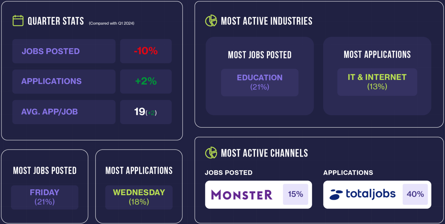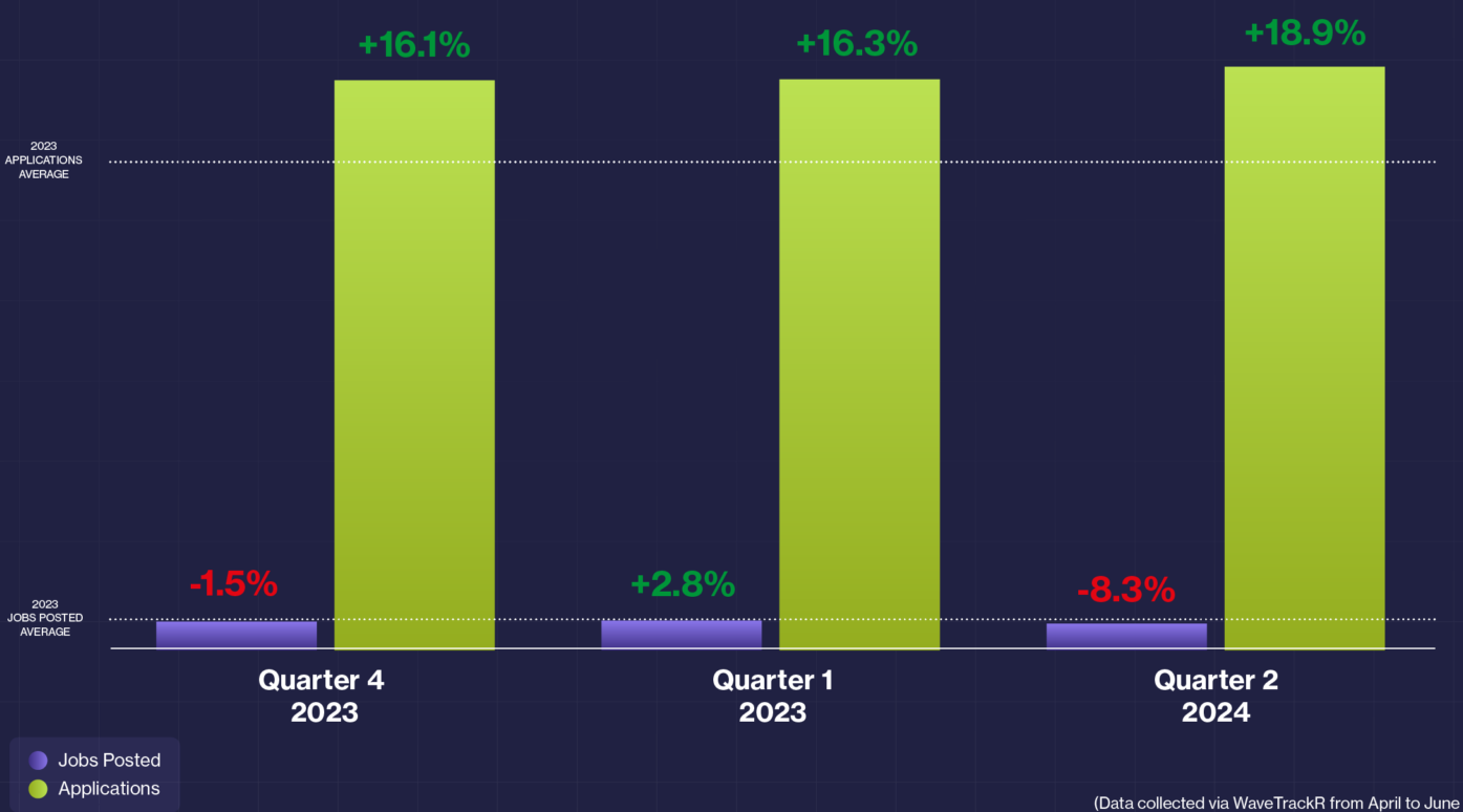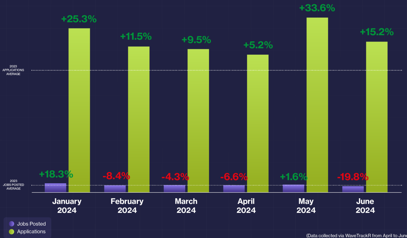 Job applications in Q2 of 2024 have continued to remain high, with May standing out as the strongest month of the year so far, showing an impressive increase of 33% compared to the average of 2023. However, the number of job postings has taken a hit, especially in June, with a significant decrease of nearly 20% from the average in 2023.