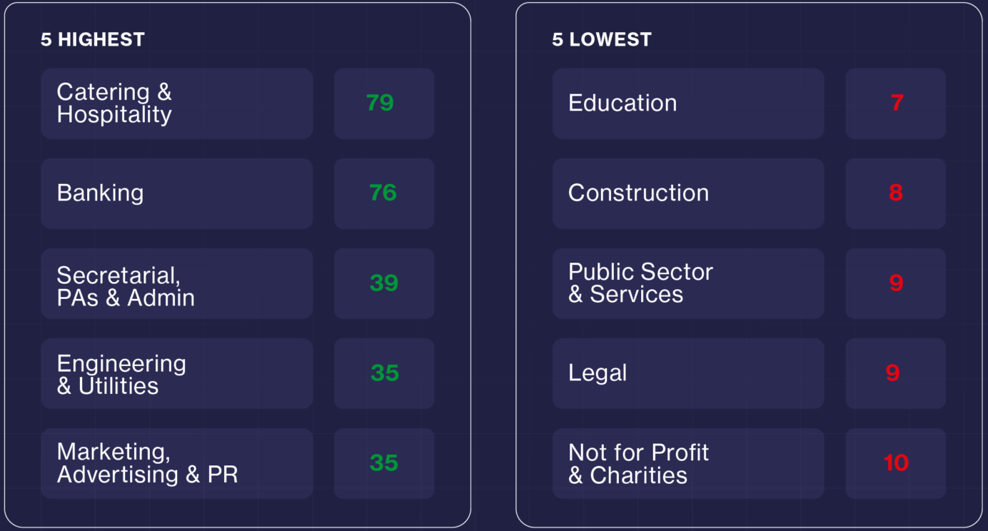 On the other end of the spectrum, industries such as Education, Construction, Public Sector & Services, Legal, and Not for Profit & Charities had significantly fewer applicants, with averages ranging from 7 to 10 applications per job.