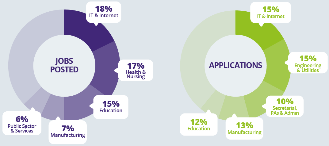 Health & Nursing posted nearly the same percentage of jobs as IT & Internet but received a tiny percentage of overall applications, illustrating the struggle that the industry continues to have with skills shortages. Public Sector is facing the same challenges. Meanwhile, Engineering & Utilities are having to cope with the opposite problem, with high levels of applications but lower jobs.