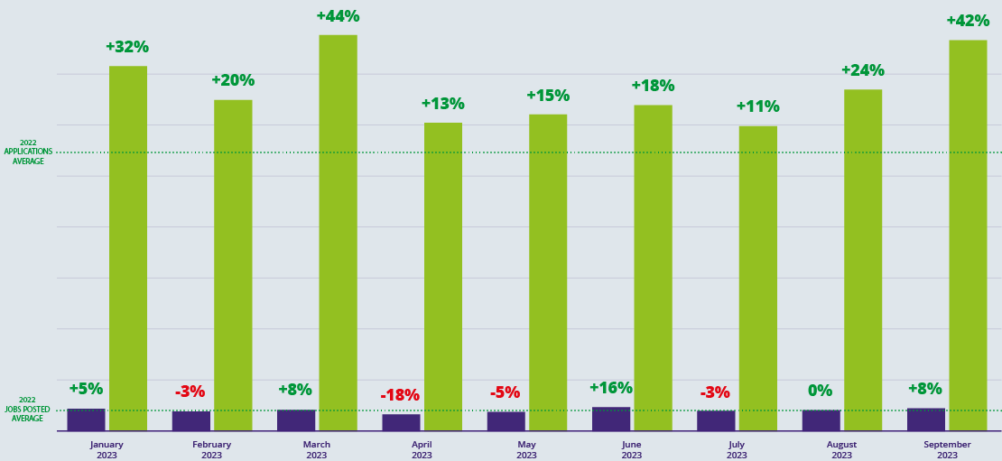 September has been an incredibly active month in the recruitment industry – something that many agencies will have been prepared for as it is an annual occurrence. Only June was more active for jobs across the entirety of 2023 so far, and applications are up there with March in terms of strength of candidate activity across the year. After the summer, there’s a real ‘school’s back in session’ feeling to September, which spills into both candidate and recruiter activity.