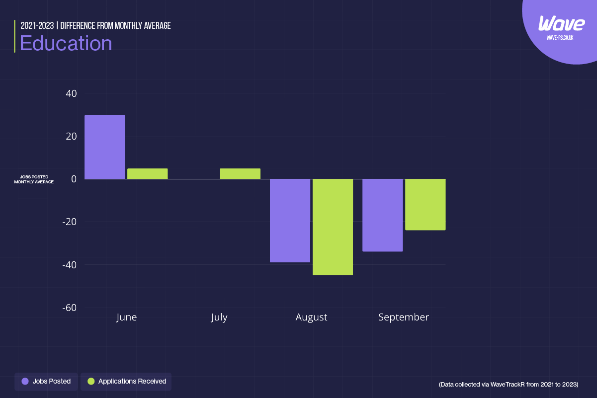 The education sector typically sees a surge in job postings in June (30.3%) as schools and universities prepare for the upcoming academic year. This demand tapers off in July and August but can spike again in September as institutions finalise their staffing needs. Applications follow a similar trend, with an 18.8% increase in June but significant declines in August (-44.6%) and September (-34.1%). Recruiters should plan ahead to ensure they can attract qualified candidates during these critical periods. Highlighting job stability and the opportunity to make a meaningful impact can be effective recruitment strategies