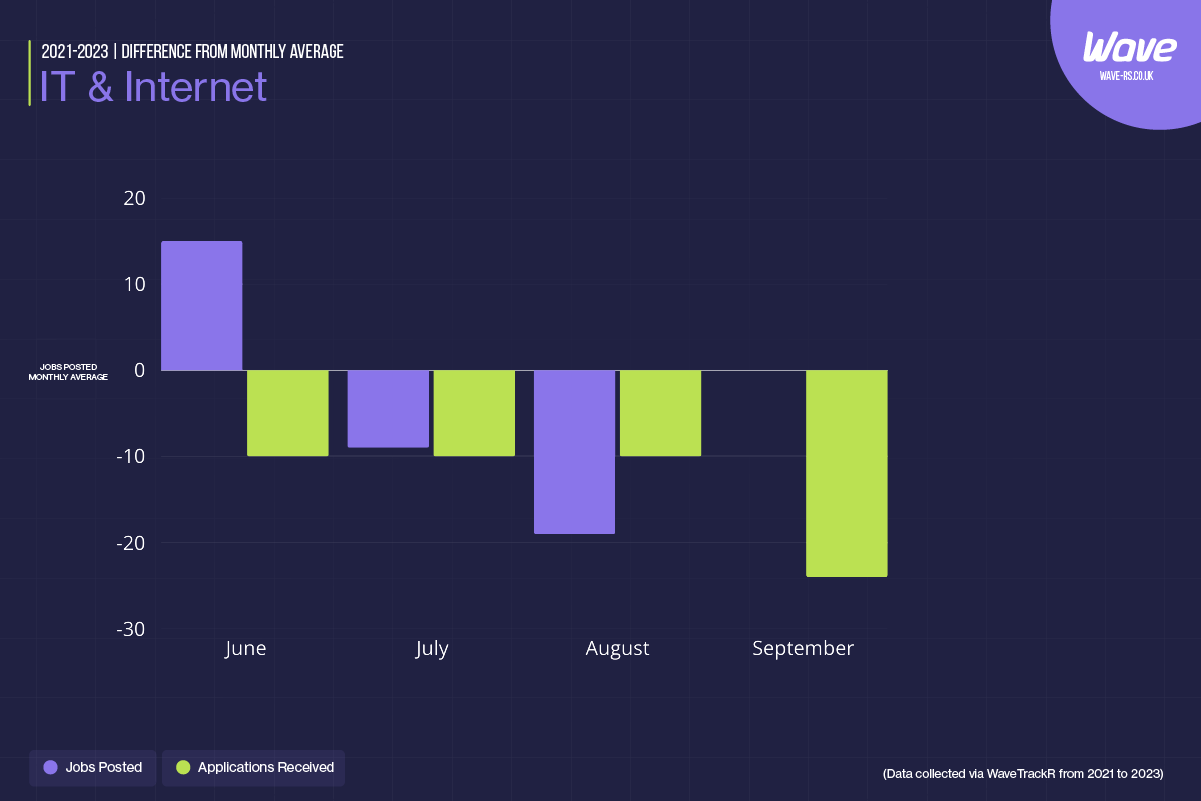 The IT & Internet sector shows a stable demand, with job postings peaking slightly in June (14.8%) but declining in the following months. Applications remain relatively stable, with a minor increase in September (0.3%). Recruiters should leverage this stability to attract candidates by highlighting the innovative projects and growth opportunities available within the industry. Emphasising tech roles’ dynamic and fast-paced nature can also be a strong selling point.