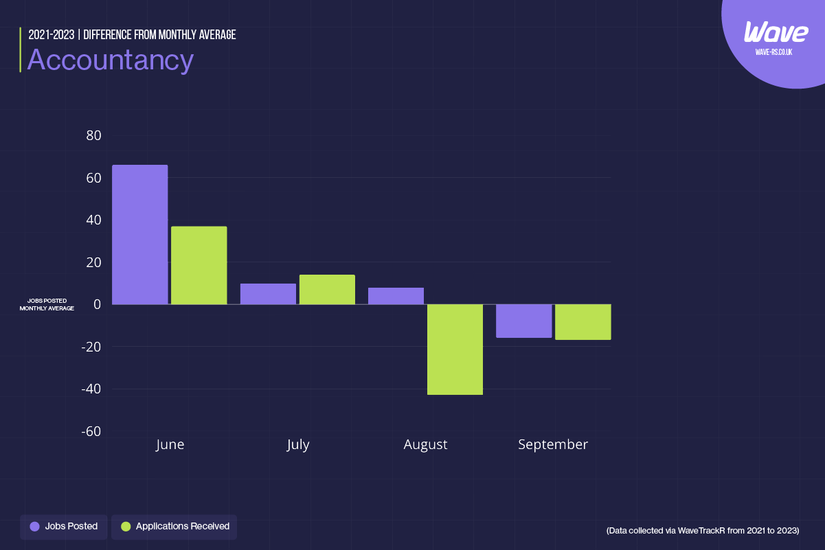Health & Nursing shows a dramatic increase in applications in June (239.1%) and July (185.7%). The need for healthcare professionals remains steady due to the continuous demand for medical services. However, job postings show fluctuations, with a slight increase in July (6.7%) but declines in the subsequent months. Recruiters should focus on maintaining a strong pipeline of candidates and emphasise healthcare workers’ critical role in the community. Offering competitive benefits and professional development opportunities can attract top talent.